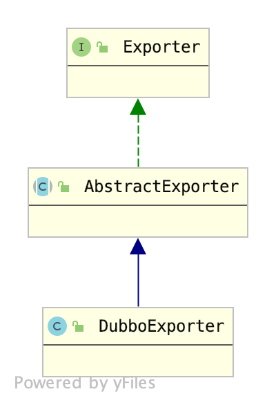 对于Protocol这一层,输入是服务URL,输出是Exporter即导出器,DubboProtocol生成的是DubboExporter,类继承结构如下: