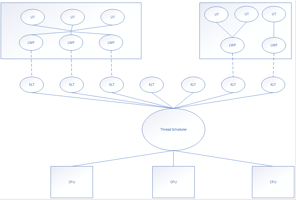 将内核线程与用户县城一起使用的混合实现方式,这种方式下,既存在用户进程,也存在轻量级进程。用户线程还是完全建立在用户空间中,因此用户线程的创建、切换、析构等操作依然廉价,并可以支持大规模的并发。而操作系统提供指出的轻量级进程则作为用户线程和内核线程的桥梁,让使用内核提供的线程调度功能及处理器映射,并且用户线程的系统调用要通过轻量级线程来完成,大大降低了整个进程被完全阻塞的风险。在这种混合模式中,用户线程和轻量级进程的数量比是不定的,即为N:M的关系。