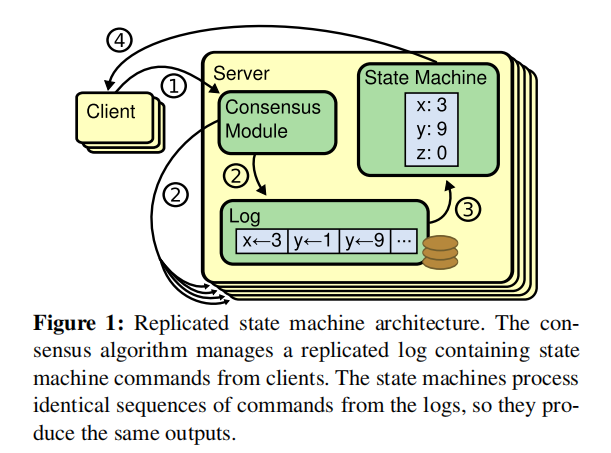 但这里存在一个问题,就是Node本身的复杂性是很高的,如果想要将整个Node的所有状态进行一个持久化,代价是巨大的。因此,采用了“复制状态机”的办法,原文定义如下: