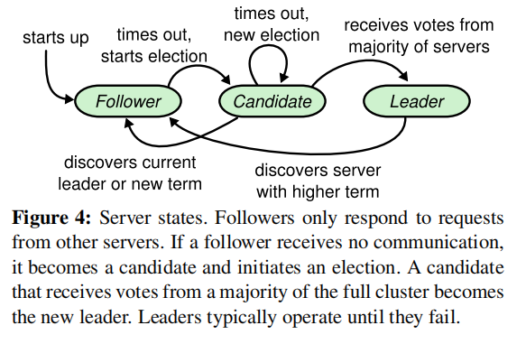 在Raft算法中,一个结点的任意时刻只能是如下三种状态的一种: